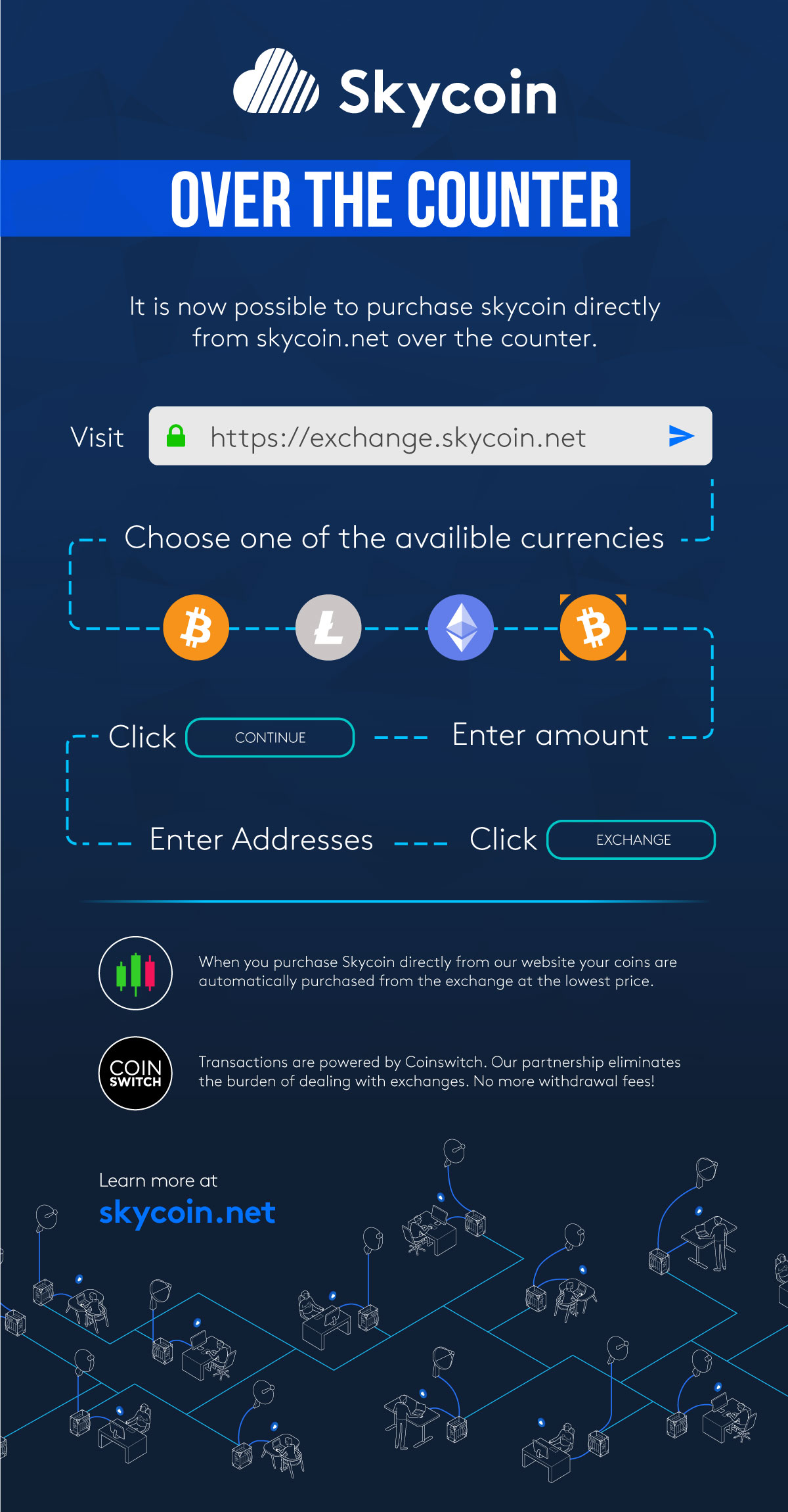When you purchase Skycoin directly from our website your coins are automatically purchased from the exchange at the lowest price. Transactions are powered by Coinswitch. Our partnership eliminates the burden of dealing with exchanges. No more withdrawal fees!