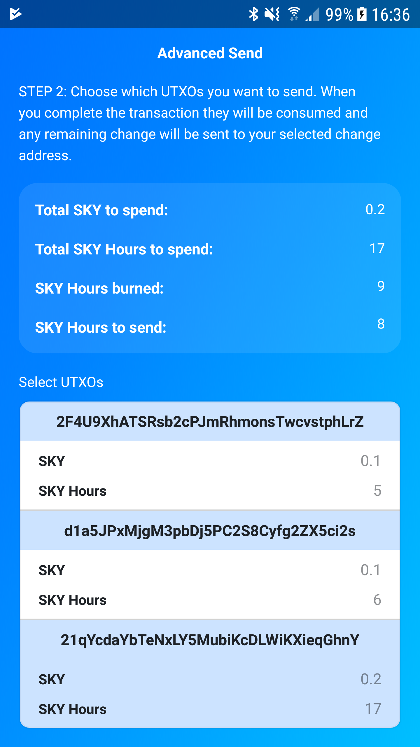 We also included a more advanced feature where you can select the specific UTXO (unspent outputs) for sending Skycoin. This allows a more flexible customization of Coin Hours usage for your needs.