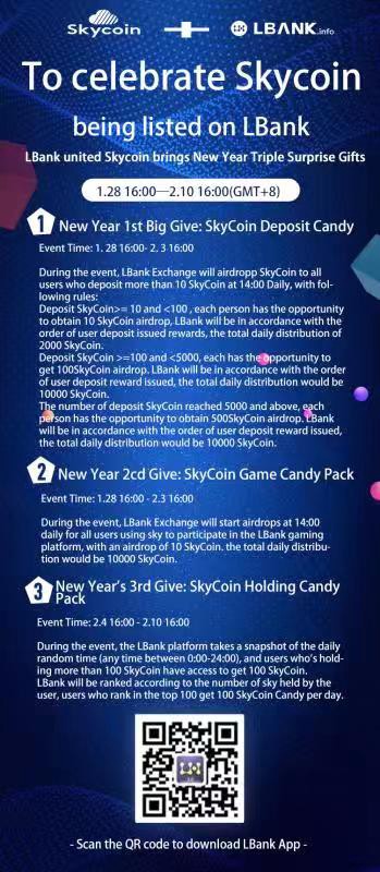 At 16:00, Jan 28th (GMT+8) Skycoin will be listed and available for withdrawal on LBank making SKY/BTC and SKY/LBCN trading pairs available. To commemorate the exchange listing, LBank and Skycoin have teamed up to provide several gifts to LBank users.